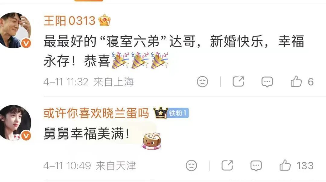 大学同寝室的王阳,喊他“寝室六弟”,真心道贺。